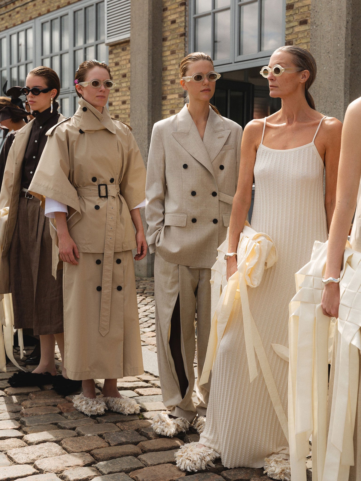 From layered trench coats to ribboned knit dresses, the eyewear carried the same quiet precision as the garments, becoming part of the collection’s rhythm and movement.