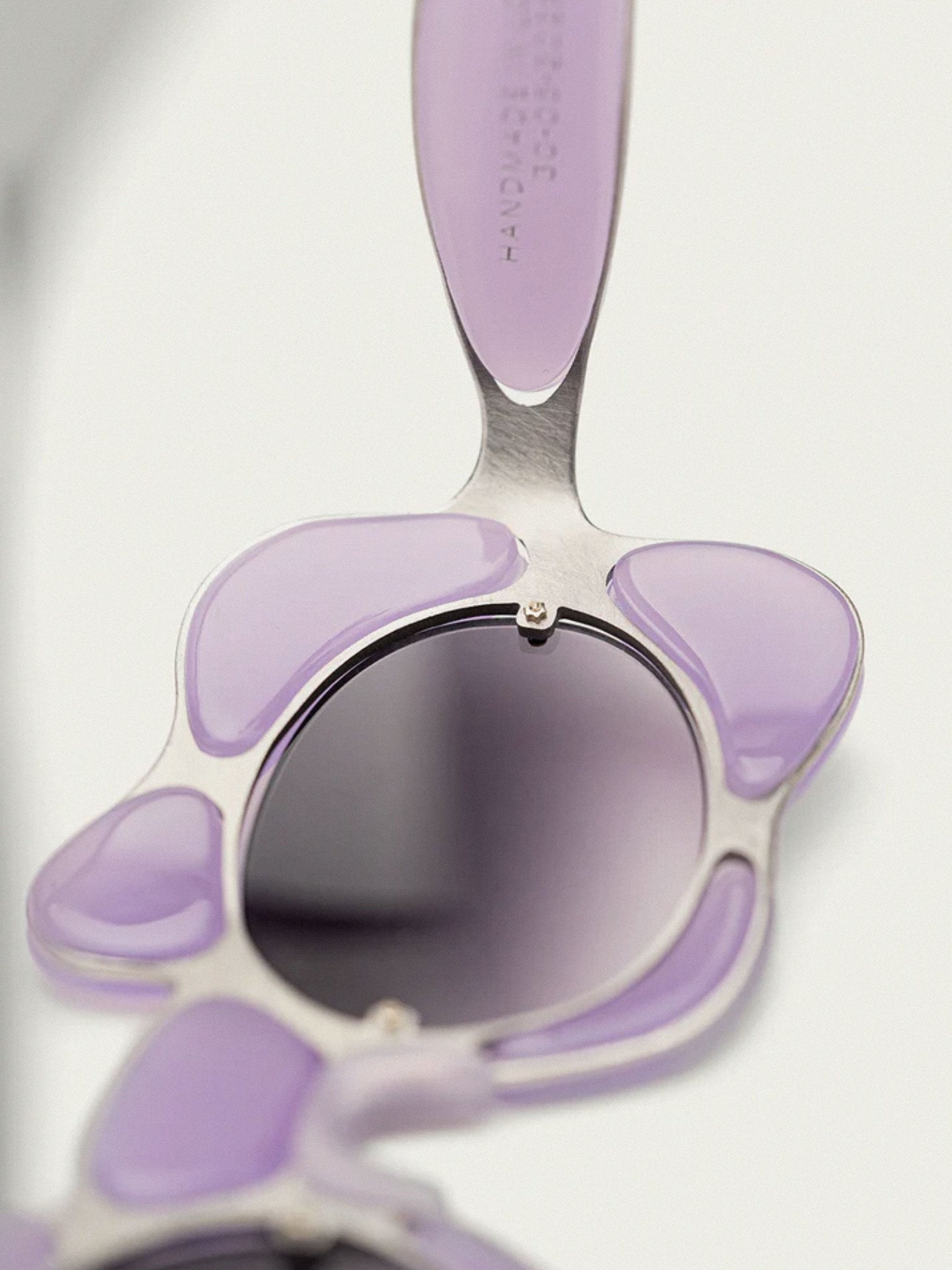 Each piece is crafted by hand by Pauline Pierre, whose background in eyewear design and craftsmanship gives the frame its tactile, almost unsettling precision. The steel is forged. The pebbles are cut and set. The shape begins to take hold.